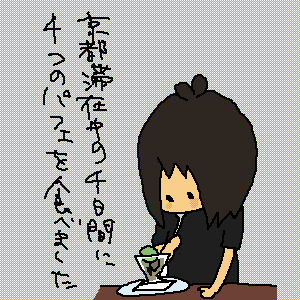 京都を観光しました。清水寺に7人で出かけますと、修学旅行生とそれらを乗せてきたタクシーでゴチャゴチャしてました。それなりの観光と、お買い物をすませ、4日目にして、4つ目の和風パフェを食べて帰りました。
